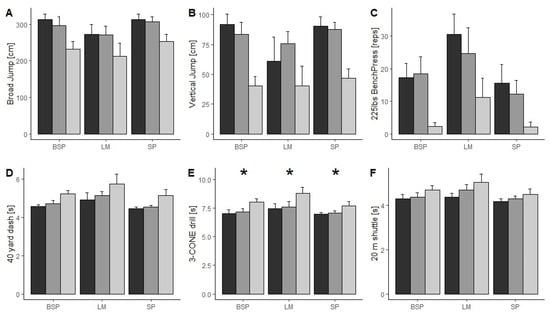 Mean and SD values for the six tests of the NFL Combine test battery performed by drafted US college players (black bars), non-drafted US college players (dark gray bars), and Italian Division I players (light gray bars); (Panel (A)) = 40-yard dash, (Panel (B)) = vertical jump, (Panel (C)) = bench press, (Panel (D)) = broad jump, (Panel (E)) = 3-cone drill, (Panel (F)) = 20-yard shuttle. * Denotes a significant team by player position interaction (p ≤ 0.05) between the Italian team and both the two US teams; BSP = big skills players; LM = lineman; SP = skills players.