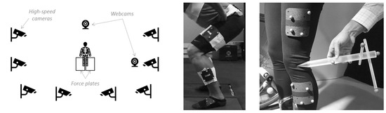 Schematic of the data collection setup featuring 2 force plates, 2 webcams, and 8 high-speed cameras (left), an example of marker cluster placements (middle), and a stylus for digitization (right). Photographs reproduced with permission from Innovative Sports Training Inc.