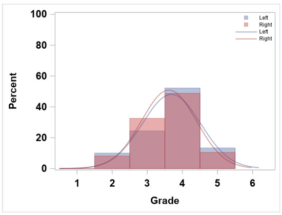 ‘Grade’ frequency (%) and smoothed normal distribution plot by ‘side’ (left and right).