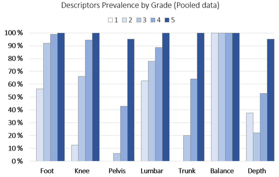 The intra-rater reliability/agreement was substantial for all features, including weighted Cohen’s kappa: ‘grade’ (0.701); unweighted Cohen’s kappa: ‘foot’ (0.789), ‘lumbar’ (0.776), ‘knee’ (0.725), ‘depth’ (0.682), ‘pelvis/hip’ (0.662), and ‘trunk’ (0.637). Since ‘balance’ had no variability, as it was present in all the observations (see Figure 3 on descriptor prevalence), including when these were re-assessed, it was not included in the agreement analysis.