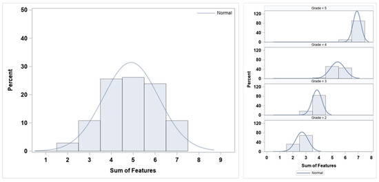 Overall (left) and by ‘grade’ (right) frequency distribution (%) of the sum of descriptors and their respective smoothed lines for normal density distributions.