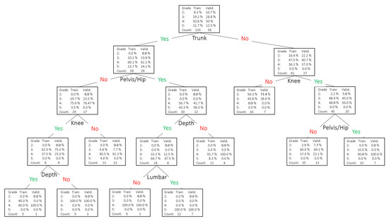 The ordinal logistic regression provided an objective view of how descriptors of movement proficiency explain the overall ‘grade’, with a 94.7% accuracy (or 5.3% misclassification rate). In 2.7% of the cases, the prediction underestimated the ‘grade’ by 1 point (e.g., observed = 4; predicted = 3), and also, in 2.7% of the cases, it overestimated it (e.g., observed = 2; predicted = 3). The fact that there were no significant changes seen in the ORL output when analyzed separately by the ‘side’ indicates that the ‘grade’ given to a single-leg squat in the studied sample does not differ between the ‘side’, suggesting that laterality (or dominance [44]) seems to be not meaningful when predicting ‘grades’ based on the descriptors. The stepwise analysis removed ‘balance’ from the model, indicating no value for differentiating between ‘grade’, as also suggested by the descriptor prevalence analysis in Figure 2. The high accuracy by the ORL using the descriptors and the relationship between the aggregation of descriptors and ‘grade’ may indicate that the descriptor battery reflects well the expert’s thought process when assessing a single-leg squat. A decision tree, with an 87.8% accuracy, was invoked to provide a visual representation of how the expert tends to associate the descriptors with better or worse single-leg squat proficiency (Figure 7). In the DT, we observe that ‘grade’ (or single-leg squat proficiency) can be explained in various ways by various combinations of associated descriptors, but ‘pelvis/hip’, ‘knee’, ‘trunk’, and ‘depth’ are the descriptors with more explanatory worth.