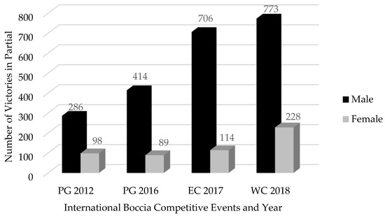 We can observe that the number of partials won by individual male players was similar between 2012 and 2018 in Boccia international-level events, with a minimum of 509 and a maximum of 577 (in BC1 and BC2, respectively). On the other hand, the number of partials won by female players was visibly lower compared to males, with a minimum of 91 (in BC1, same as in the male cohorts), and a maximum of 188 (in BC3).
