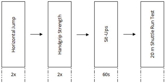 The fitness assessment protocol comprised the following fitness tests: (i) horizontal jump (HJ); (ii) handgrip strength (HG); (iii) 60 s sit-ups; and (iv) 20 m shuttle run (Figure 1. The protocol was applied on the same day, with similar weather conditions, and the variables under analysis were (i) left HG (kg); (ii) right HG (kg); (iii) HG sum (kg); (iv) HJ (m); (v) 60 s sit-ups (n); (vi) 20 m shuttle run test (n); and (vii) VO2max (mL/kg/min). All participants completed a familiarisation session, and the order of the fitness tests (Figure 1) assumed a progressive increase in fatigue [], with a ten-minute interval between tests. The fitness assessment protocol for POs was recently published, and a detailed description can be seen in Freitas et al. [].