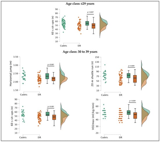 Distribution and differences in fitness attributes of male police officers (POs) from the Lisbon Met-ropolitan Command (Portugal) rapid intervention teams (EIR) and cadets from the Police Academy, from the ≤29 years and 30–39 years age groups, after controlling for age.