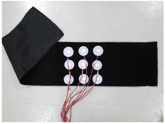 Vibratory sensations in the trunk and sole regions were evaluated in the three groups using the developed vibratory stimulation device (Kyowa Electronic Instruments Co., Ltd., Tokyo, Japan). The main specifications of the vibrators (diameter 14 mm, thickness 3.7 mm, weight 1.6 g) included a frequency range of 150 Hz, a voltage of 3 V, and a duration of one simulation time of 1 s. The vibratory stimulation intensity was maintained at a constant level with no variation. The vibratory sensation in the trunk region was evaluated using a developed vibratory stimulation device. Vibratory stimulation was delivered to the trunk region via a belt worn around the participant’s trunk, which was fitted with nine vibrators arranged in a pattern 15 cm vertically × 20 cm horizontally (Figure 1 and Figure 2). Participants were instructed to respond to how many vibrators they could identify. Table 1 lists the trunk vibration stimulation patterns. For a single trial, the participants were presented with 26 vibratory stimuli, and one trial each was carried out on the left, center, and right sides of the trunk, yielding a total of 78 stimuli. Three vibration patterns were presented randomly: stimulation at zero sites, stimulation at one site, and simultaneous stimulation at two sites. Additionally, for simultaneous stimulation at the two sites, the two vibrators were placed vertically, horizontally, and diagonally (Table 1).