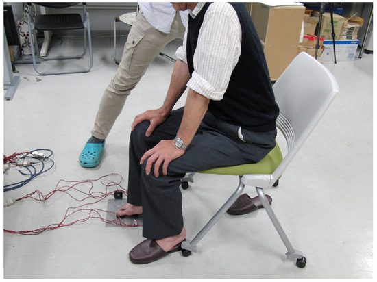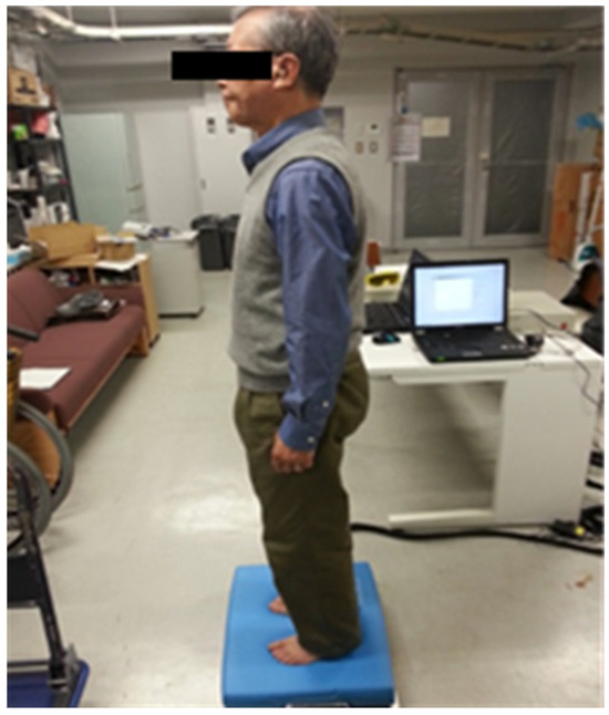 The measurement device for the standing balance was a force plate (Kyowa Electronic Instruments Co., Ltd.) that measured body sway parameters (Figure 5), which contained four transducers, one in each corner of the force plate, to measure the vertical forces indicating postural sway. The signals from the transducers were amplified and digitized using a computer. The computer program provided several indices of body sway calculated from the center of pressure. The accuracy and hysteresis of the force plate were ±1% and ±0.1%, respectively. The sampling rate of the force plate was 100 Hz.