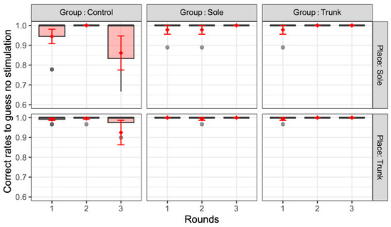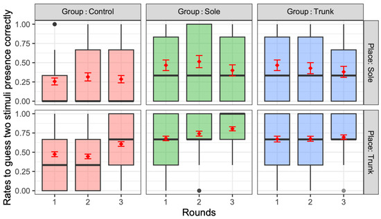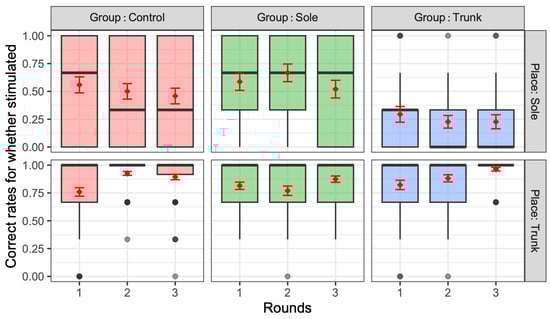 Figure 6, Figure 7 and Figure 8 present the correct rates for guessing no stimulation, identifying when one vibration was presented, and identifying when two stimuli were presented, respectively. In these figures, the correct rate of vibration is plotted for each training group (control, sole, and trunk) and presentation location (sole and trunk) in relation to the number of rounds (one, two, and three). The thick black horizontal lines of these figures represent the median, while the red diamonds and error bars indicate the mean and standard error, respectively. In the absence of vibration, the mean and median percentages of correct responses were generally above 90%, regardless of the group allocation, stimulus location, or number of rounds, suggesting that few participants in the experiment experienced daily phantom vibrations. However, as the number of rounds increased, the percentage of such correct responses in the sole and trunk training groups increased, while in the third round, the percentage of correct responses in the sole and trunk presentations was 100% for both the sole and trunk groups, indicating that only the control group had a significant number of errors (χ2(2) = 7.26, p = 0.027 < 0.05. The adjusted Pearson’s residual value for the control group were as follows: 2.69, p = 0.043 < 0.05).