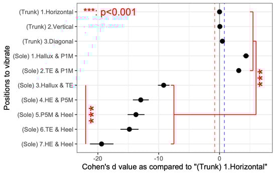 Effect size of the correct response rate for each of the two stimulus locations on the trunk and sole for participants to correctly guess the presence of the two stimuli. Effect sizes are relative to the (Trunk) 1. Horizontal condition. Significant differences were obtained through multiple comparisons. The red and blue dotted lines indicate values with large effect sizes.