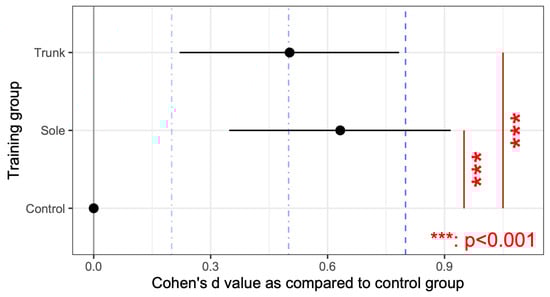 When comparing the training groups, the anterior and posterior tilts and the total LoS test for both the trunk and sole training groups were larger than those of the control group for factors where significant differences were observed. In the anterior tilt, the sole exercise group showed significantly greater improvement than the trunk exercise group (p = 0.013 < 0.05, d = 0.27 (small)), whereas in the posterior tilt, the trunk exercise group showed significantly greater improvement than the sole exercise group (p < 0.001, d = 0.46 (medium)). There was no significant difference in the left and right tilts between the plantar and trunk groups (p > 0.10, d < 0.2 (negligible)).