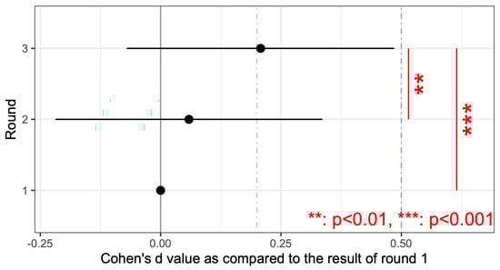The rate of correctly guessing the presence of the two stimuli tended to be higher in both the trunk and sole training groups compared with the control group (p < 0.001). Moreover, the correct rates changed with repetition, with the training group showing a significant increase in the correct rates for trunk vibrations. Figure 9 presents the correct rates for each combination of the two stimulation points in the sole and trunk, with an effect size d, as compared with the performance of the horizontal vibration on the trunk for convenience. For the sole, the percentage of correct responses was significantly higher when stimulation was applied to the proximal first metatarsal (P1M) and anywhere else vs. when stimulating the other two points of the sole. In particular, the correct response rate was significantly lower when the heel was stimulated than when the first proximal metatarsal was stimulated. The two-point discrimination results for the trunk were also significantly more accurate than those for the sole, except when the proximal first metatarsal and another point were stimulated. For convenience, Figure 10 presents the relative correct rates when two vibrations were presented on the trunk for each training group, with an effect size d, when compared to the control group. The correct response rates were significantly higher in the trunk and sole training groups than in the control group. Figure 11 presents the correct rates in the training sessions for convenience, with an effect size d, when compared to the results of round 1. The correct rates for round 3 were significantly higher than those for rounds 1 and 2.