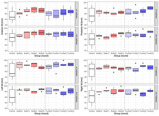 Dynamic balance performance with and without a mattress. Top left: anterior tilt, top right: posterior tilt, bottom left: left tilt, bottom right: right tilt. The top and bottom of each graph indicate the case with and without a mattress, respectively. Round 0 refers to the period before the intervention. The box plots in white, red and blue are the results for the control, sole training and trunk training groups, respectively.