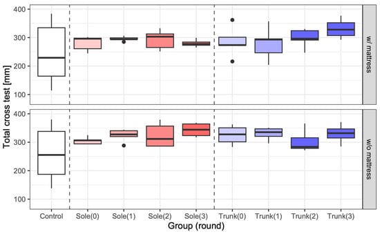 Performance of the total LoS test with and without a mattress. Round 0 refers to the period before the intervention. The box plots in white, red and blue are the results for the control, sole training and trunk training groups, respectively.