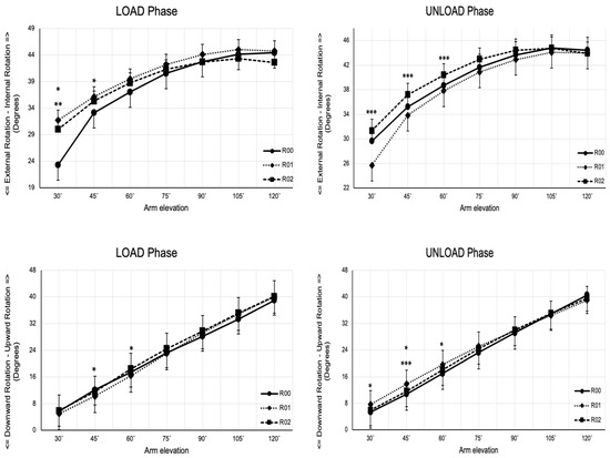 Scapulothoracic rotation across selected angles of arm position (angles) during the LOAD and UNLOAD phases of continuous arm elevation exercise. Data are mean ± Standard Error of the Mean. Significant resistance-by-arm elevation interactions are denoted as * R00 vs. R01, ** R00 vs. R02, and *** R01 vs. R02.