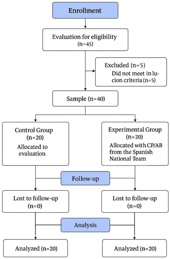 After the application of the exclusion criteria, 40 participants were finally included in this study (Figure 1). The EG was finally composed of 20 male international CP football players (age: 25.9 ± 6.57 years, body mass: 68.8 ± 8.13 kg, body height: 1.74 ± 0.07 m, BMI: 22.5 ± 2.39 kg·m2, training frequency: 3.85 ± 0.22 days per week). This group was also composed of 5 players with bilateral spastic hypertonia, 3 players with athetosis/ataxia, and 12 players with unilateral spasticity. On the other hand, the CG was finally composed of twenty male football players (age: 22.6 ± 4.07 years, body mass: 71.5 ± 9.34 kg, body height: 1.76 ± 0.07 m, BMI: 23.3 ± 2.52 kg·m2, training frequency: 2.9 ± 0.31 days per week).