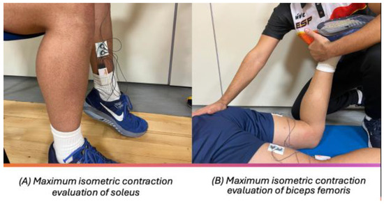 One experienced independent physiotherapist who assessed the suitability of each participant, based on the inclusion and exclusion criteria, examined the participants at the baseline. These researchers were not involved in the measurements. The assessment protocol was as follows: the participants, after a short warm-up of 3 min based on joint mobility and a short rest, proceeded to have the electromyographic activity of the following muscles assessed bilaterally: soleus, adductor magnus, and biceps femoris. These muscles have been selected because they are the muscles valued in the CP football classification system, due to their clear impact on the game (IFCPF, 2024) [3]. The electrode placement protocol for recording was described by Molina et al. [14]. The muscle activity was measured at the baseline and at maximum isometric contraction (MIC) of each muscle pair. The duration of each recording was 5 s. All assessments were carried out on both the non-dominant or affected leg (the leg with the greatest impact of the disability and the lesser ability to play football) and on the musculature of the dominant or non-affected (which could be “less affected”) leg (the leg with no or lower impact of the disability and with a greater ability to play football). All data were recorded with the system and transferred and restored to a portable computer via a USB cable for further analysis.