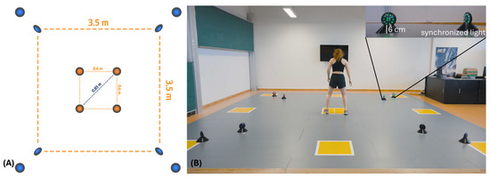 All testing was performed indoors in a lab of the affiliated university. All FAST conditions were executed with the Fitlight System (FITLIGHT Sports Corp., Aurora, ON, Canada) using the application for mobile devices (App Version 2.5.7a) with the Wifi Light System (Version 1.31). The Fitlight System has shown high reliability in COD and reactive agility testing [25,29]. The test setup (Figure 1A) consists of a small square (0.60 m × 0.60 m), which was used as the setup for the FAST_cognitive (FAST_COG) and as the starting position for the following conditions. Furthermore, a larger square (3.5 m × 3.5 m) was used for FAST_motor (FAST_MOT) and the “Simple Agility Test” (FAST_SAT). The Fitlights were positioned in the corners of the square [14,16]. The sensors were placed upright in approximately 6 cm high cones in the latter setup. In addition to these lights, synchronized lights were placed in each corner 70 cm apart and with the LED facing the center position, to ensure that the participants were able to recognize the lights correctly (Figure 1B). In every condition, one corner of the square lit up green and beeped. The remaining Fitlights lit up red and did not present sound. The Fitlights were deactivated through a step near the Fitlight, which activated the proximity sensor (up to 80 cm). Participants were instructed to deactivate the targeted light as fast as possible. In each condition, a sequence of eight lights (each corner two times) had to be deactivated per trial. Between each stimulus, a delay of approximately two seconds was set to provide sufficient time to return to the center of the square.