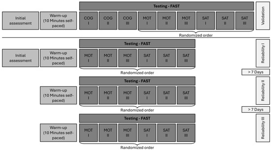 Overview of the experimental protocol. For validation purpose participants performed the cognitive (FAST_COG), motor (FAST_MOT), and “Simple Agility Test” (FAST_SAT) three times in one session. For reliability testing, participants came in on three days with at least seven days’ break between the sessions. Reliability sessions consisted of three trials of the FAST_MOT and the FAST_SAT in a randomized order.