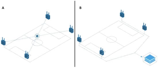 32]. The system used in this study consisted of 14 antennas positioned around the handball court at three different heights. A tag was placed in the center of each player’s upper back using the manufacturer’s harness. The data were collected at 20 Hz and processed via the specific Kinexon Software (ver. 3.2.6, Kinexon Web Application, Munich, Germany). The signals were transmitted to the antennas using UWB technology at a frequency range of 4.25–7.25 GHz. The field position of the tag was calculated using a proprietary algorithm based on a combination of different methods, such as Time Difference of Arrival, Two-Way Ranging, and Angle of Arrival [