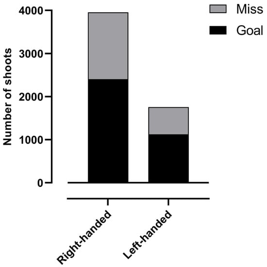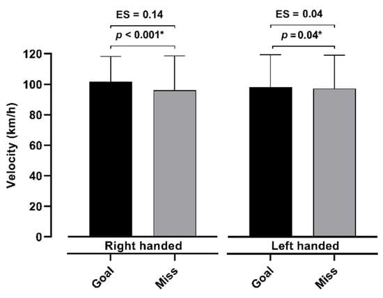 38]. Such findings indicate that fast and rapid breaks through defensive lines increase the possibility of scoring. Moreover, the velocity of the shots differed significantly between goals and misses. However, the observation of the effect sizes showed that such differences had little effect. This can be explained by the playing positions. Both the left- and right-handed players played in similar positions (i.e., wings and backs). Therefore, their mean velocities were similar.