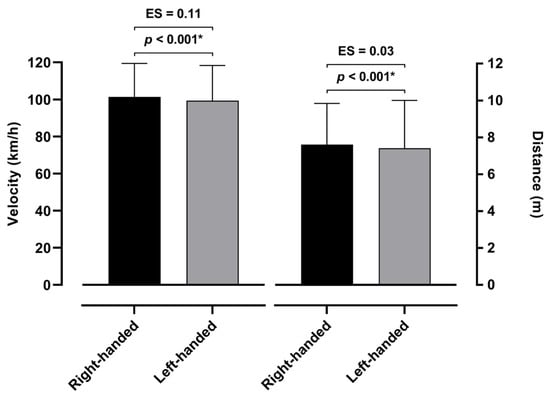 p < 0.001). Precisely, the right-handed players shot at a higher velocity (101.38 ± 18.00 km/h) than the left-handed players (99.36 ± 18.89 km/h). A similar difference can be observed in the distance of the shots (7.61 ± 2.23 m and 7.42 ± 2.59 m, respectively). Furthermore, the effect size analysis demonstrates small sizes between both variables, precisely, 0.11 for the velocity of the shot and 0.03 for the distance between the right- and left-handed players.