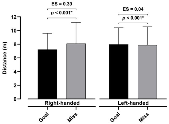 p = 0.04). Similarly, the distance of the shots differed between the scored and missed shots (right-handed,