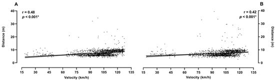 Figure 6 demonstrates the correlations between the velocity and distance of the shots for both the left- and right-handed players. The results show a statistically significant correlation of 0.48 (