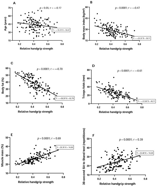 Correlations between relative handgrip strength and age (A), body mass index (B), body fat (C), triceps skinfold (D), muscle mass (E), and the 30 s sit to stand test (F).