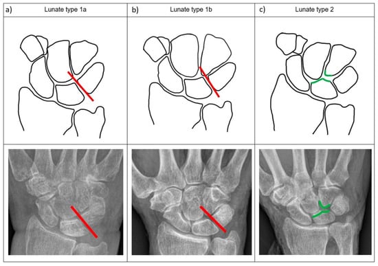 - Rachunek, K.; Springer, F.; Barczak, M.; Wahler, T.; Daigeler, A.; Medved, F. Lunate morphology: Association with the severity of scapholunate ligament injuries and carpal instability patterns. J. Plast. Surg. Hand Surg. 2022, 56, 151–159. [Google Scholar] [CrossRef]