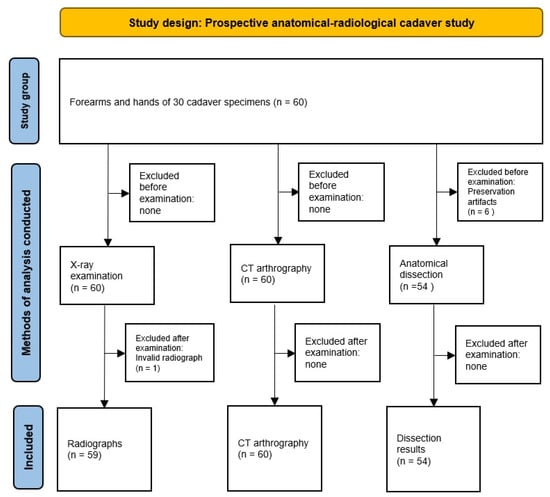 Of the 30 body donors, 42 female and 18 male cadavers, with 60 wrists, were included in our study. The age of the donors ranged from 57 to 93 years, with a mean age of 81.13 (SD ± 9.63). A total of 59 wrists were examined radiologically, 60 wrists were assessed using CT arthrography, and 54 wrists were evaluated anatomically in situ (Figure 2).