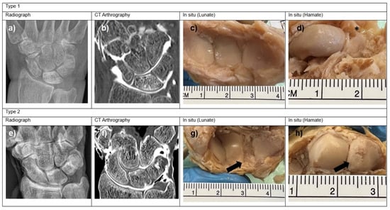 Radiographs, CT arthrographs, and in situ photographic documentation of lunate type 1 (a–d) and lunate type 2 (e–h) conducted on the same specimens. Arrows indicate osteoarthritis, and Asterix indicates preparation artifact (fracture).