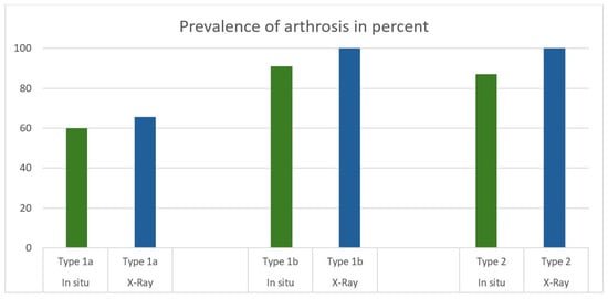 Prevalence of arthrosis in the subclassified lunates in X-ray and in situ, using the radiologic differentiation of type 1a and type 1b for the in situ data.