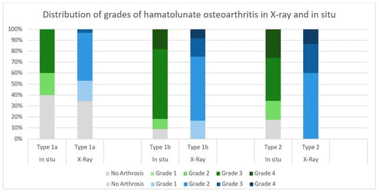 Our study confirms the comparability of the two classifications in the context of the carpal region. In both the radiological and in situ examinations, type 1b lunates showed considerably more frequent and more severe signs of hamatolunate osteoarthritis than type 1a lunates. The occurrence of arthrosis was 100% in X-rays and 90.9% in situ for type 1b lunates, whereas type 1a lunates showed a prevalence of 65.6% in X-rays and 60% in situ. Radiologically, there was a significant difference in the degree of hamatolunate osteoarthritis between type 1a and type 1b in p.a. X-rays, with type 1b showing more severe damage (p = 0.02). A significant difference in the occurrence and degree of osteoarthritis was demonstrated between type 1a and type 2 lunates (p = 0.01), with type 2 showing considerably more severe osteoarthritic changes. On the other hand, there was no significant difference in the occurrence or severity of hamatolunate osteoarthritis between type 1b and type 2 lunates. The data strongly supports our hypothesis that type 1b, such as type 2, predisposes individuals to the occurrence and severity of hamatolunate osteoarthritis.