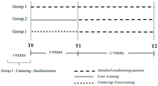 Through simple randomization, the 44 participants were divided into three groups (Group 1: 14 subjects, mean age = 15.5 ± 1.5 years; Group 2: 16 subjects, mean age = 15.7 ± 1.3 years; and Group 3: 14 subjects, mean age = 15.5 ± 1.5 years). Each group followed an individualized training program for 8 weeks (intervention duration). A baseline evaluation of all athletes was performed (T0); moreover, all groups were assessed at the end of the intervention period (T1), and 12 weeks after the end of the intervention period (T2), respectively. The study design timeline of the testing sessions is reported in Figure 1.
