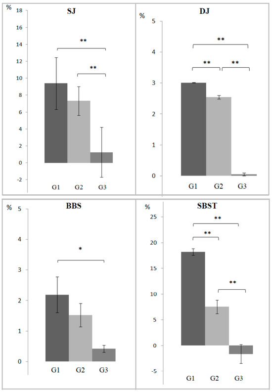 The y axis represents the percentage of variation (post- to pre-intervention: T1−T0) of the significant tests in the three groups. The values are reported as mean and standard error. * = p < 0.05 significant difference between groups; ** = p < 0.01 significant difference between groups. Abbreviations: BBS, Berg Balance Scale; SBST, Stork balance stand test; SJ, squat jump test; DJ, drop jump test. G1 = Group 1; G2 = Group 2; and G3 = Group 3.