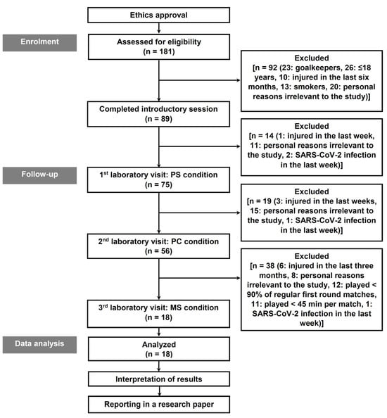 Recruitment targeted male third National Division Greek Football players (16 clubs), with 351 registered individuals informed about the study. Of the 181 interested players, 163 were excluded either due to non-compliance with inclusion criteria or personal withdrawal unrelated to the study (Figure 1). Ultimately, 18 soccer players (tier 3, [57]: 6-defenders, 7-midfielders, 5-attackers) meeting the criteria (age = 25.00 ± 5.05 yr, height = 180.77 ± 5.93 cm, body mass = 78.51 ± 5.25 kg, body fat = 10.50 ± 1.67%, experience in soccer = 7.22 ± 3.63 yr, soccer-related training = 9.82 ± 1.33 h·wk−1) comprised the study cohort.