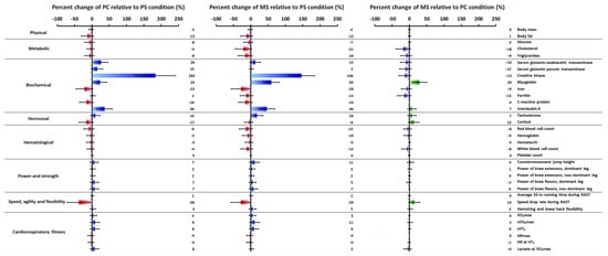 Table 1 displays the physical data; Table 2 displays the metabolic, biochemical, and hormonal data; Table 3 displays the hematological data; Table 4 displays the power, strength, speed, agility, and hamstring and lower back flexibility data; and Table 5 displays the cardiorespiratory fitness data for PS, PC, and MS conditions, respectively. Detailed results of the Bonferroni-adjusted post hoc comparisons (PS-PC, PS-MS, and PC-MS), including exact p-values and corresponding Cohen’s d effect sizes with corresponding 95% CIs for pairwise comparisons between conditions (PS-PC, PS-MS, and PC-MS) across all variables, are provided in Tables S1 and S2 (see Supplementary Materials), respectively. Moreover, Figure 3 illustrates the percentage changes in all parameters from PS to PC, from PS to MS, and from PC to MS. Briefly, the period from the PS to the PC condition was marked by significant changes (p ≤ 0.05), including reductions in body fat (−12.86 ± 0.38% [−30.45–4.74]) and speed drop rate (−37.96 ± 0.72% [−71.39–−4.53]), alongside significant improvements (p ≤ 0.05) in physiological and performance metrics such as V̇O2max (+4.43 ± 0.21% [−5.08–13.94]), vV̇O2max (+8.81 ± 0.28% [−4.28–21.91]), and vVT2 (+8.35 ± 0.28% [−4.43–21.13]). Concurrently, substantial fluctuations (p ≤ 0.05) were noted in white blood cell count (−4.32 ± 0.21% [−14.13–5.49]) and in biochemical markers, creatine kinase (+183.48 ± 1.24% [126.31–240.66]), myoglobin (+23.10 ± 0.42% [3.63–42.57]), and cortisol (−16.55 ± 0.44% [−36.84–3.74]) were noted. From the PS to the MS condition, a significant reduction (p ≤ 0.05) in body fat (−12.38 ± 0.37% [−29.61–4.85]) and speed drop rate (−29.20 ± 0.61% [−57.57–−0.82]) was accompanied by significant enhancements (p ≤ 0.05) in countermovement jump performance (+10.5 ± 0.31% [−3.66–24.67]), V̇O2max (+4.57 ± 0.21% [−5.08–14.23]), vV̇O2max (+10.76 ± 0.31% [−3.55–25.08]), and vVT2 (+8.88 ± 0.28% [−4.26–22.02]). This condition also exhibited pronounced alterations in white blood cell count (−12.03 ± 0.37% [−28.99–4.93]), biochemical and hormonal parameters, including significant changes in creatine kinase (+146.21 ± 0.82% [108.24–184.18]), myoglobin (+59.1 ± 0.49% [36.39–81.81]), interleukin-6 (+46.08 ± 0.5% [23.05–69.11]), testosterone (+17.68 ± 0.38% [0.05–35.3]), and cortisol (−6.29 ± 0.26% [−18.24–5.66]). In contrast, several markers—lower limb strength, hamstring and lower back flexibility, triglycerides, C-reactive protein, ferritin, serum glutamic-oxaloacetic transaminase, serum glutamic-pyruvic transaminase, red blood cell count, hemoglobin, and hematocrit—remained stable throughout the study period.