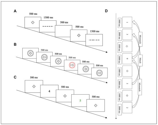 Flow diagram of the executive functional tasks. (A) Flow diagram of the Flanker task. (B) Flow diagram of the SST. (C) Flow diagram of the 2-Back task. (D) Flow diagram of the MOS task.