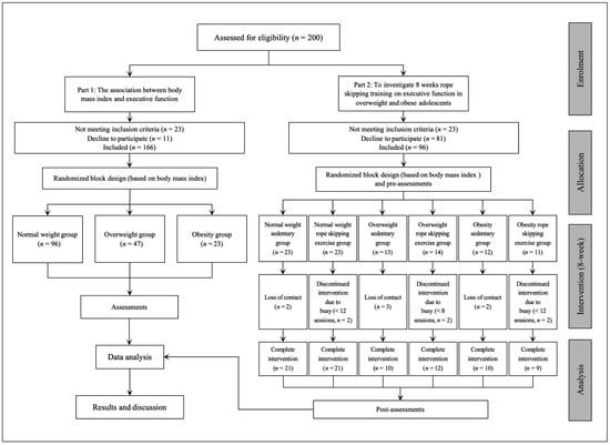 This study conducted two evaluations. Part one: We aimed to identify the association between BMI and EF in adolescents. We hypothesized that there would be a negative correlation between higher BMI and poorer cognitive performance in adolescents. Part two: We aimed to identify and investigate the effect of an 8-week moderate-to-high-intensity rope skipping training program and whether it improved EF in the overweight/obese adolescents’ group. It was hypothesized that EF would be improved by rope skipping exercise intervention in overweight/obese adolescents.
