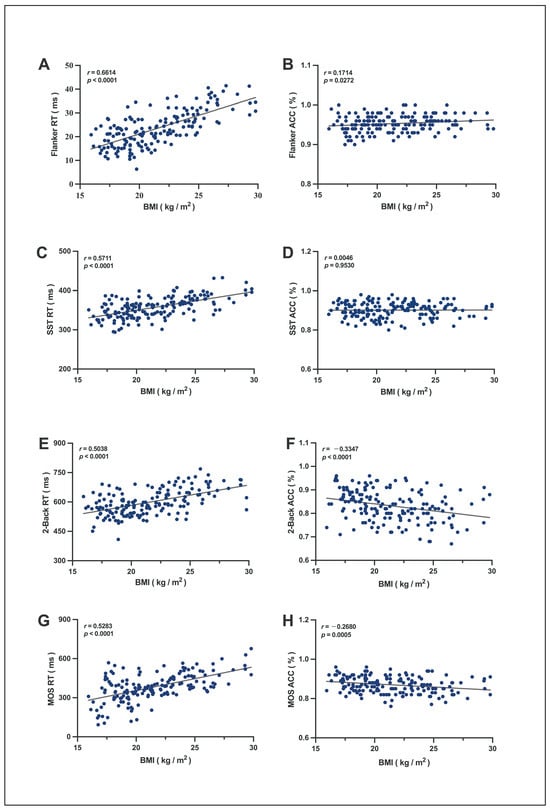 There was a significant linear positive correlation between BMI and the RT of the Flanker task (r = 0.6614, p < 0.0001, Figure 3A), SST (r = 0.5711, p < 0.0001, Figure 3C), 2-Back task (r = 0.5038, p < 0.0001, Figure 3E), MOS task (r = 0.5283, p < 0.0001, Figure 3G), the accuracy of the Flanker task (r = 0.1714, p = 0.0272, Figure 3B), 2-Back task (r = −0.3347, p < 0.0001, Figure 3F), and MOS task (r = −0.2680, p = 0.0005, Figure 3H). This result indicates that a higher BMI leads to a longer response time in EF tasks; therefore, participants with a higher BMI exhibited lower accuracy in the 2-Back and MOS tasks. Higher BMI was significantly associated with longer reaction times across all EF tasks (Flanker, SST, 2-Back, MOS; all r > 0.50, p < 0.0001) and reduced accuracy in working memory and cognitive flexibility tasks (2-Back/MOS; r = −0.27 to −0.33, p ≤ 0.0005), indicating higher BMI is linked to slower thinking speed and lower accuracy.