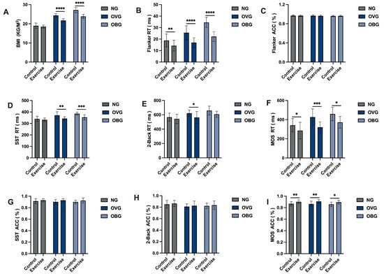 Comparison of EF after exercise intervention. Comparisons of the following parameters after exercise intervention: (A) BMI, (B) Flanker task reaction (ms), (C) Flanker task accuracy (%), (D) SST reaction (ms), (E) 2-Back reaction (ms), (F) MOS task reaction (ms), (G) SST accuracy (%), (H) 2-Back accuracy (%), and (I) MOS task accuracy (%). N-C, Normal weight control group; N-E, normal weight exercise group; OV-C, overweight control group; OV-E, overweight exercise group; OB-C, obese control group; OB-E, obese exercise group; RT, reaction time; ACC, accuracy; * p < 0.05, ** p < 0.01, *** p < 0.001, and **** p < 0. 0001.