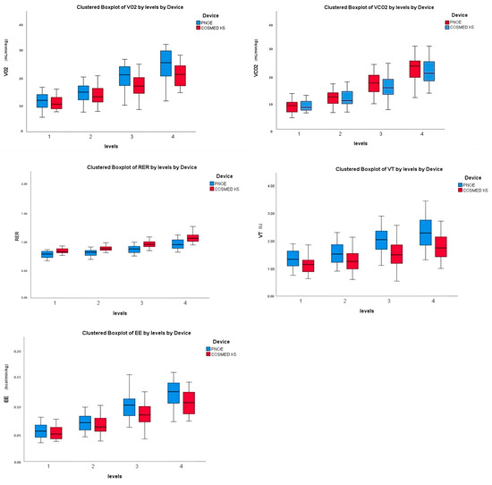 Comparison of cardiometabolic variables across levels of exercise spectrum between PNO and COSMED K5. Box and whisker plot present median, 25th and 75th percentiles for metabolic variables including VO2, VCO2, RER, VT, and EE.