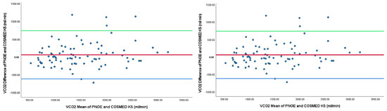 Bland–Altman plots for the relationships between the two systems are shown in Figure 3. The Bland–Altman plots look for evidence of proportional bias. It was a simple way to evaluate a bias between the mean differences, and to estimate an agreement interval, within 95% of the differences in the two metabolic carts of PNO and COSMED K5. Cases outside the upper and lower confidence intervals should also be noted.