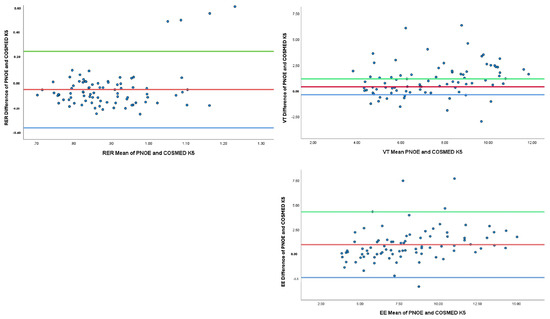Agreement between PNO and COSMED K5 for VO2, VCO2, RER, VT, and EE. Red line: Mean reference line for agreement; Green and Blue line: Limit reference line of agreement.