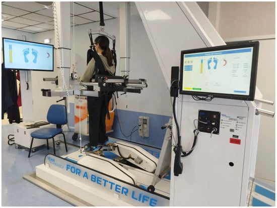 Inclusion criteria were (i) hemiplegia/hemiparesis due to a first-ever stroke; (ii) at least one year after stroke; (iii) supervision-dependent ambulation (Functional Ambulation Classification—FAC ≥ 3); (iv) patients aged between 18 and 75 years. Patients were excluded if they presented the following criteria: (i) age > 75 years; (ii) diagnosis of concurrent psychiatric conditions or other significant medical comorbidities that could interfere with the RGT; (iii) presence of deficits (e.g., cognitive, visual, or auditory) that could limit the comprehension and/or execution of the proposed exercise; (iv) comorbidities that prevented upright posture and walking (e.g., hypotension); (v) refused consent or were unable to provide informed consent; (vi) recent bone fractures. In addition, we excluded patients if they had contraindications to the use of the technological instrumentation, such as a weight > 150 kg and open lesions or bandages in contact with the harness.