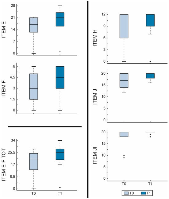 Figure 2. Fugl-Meyer Assessment—Lower extremity (FMA-LE) scores evaluated before and after RGT in the EG. The figure shows boxplots for each item of FMA-LE comparing before (T0—light blue) and after (T1—dark blue) RGT. Item E = lower extremity; Item F = coordination/speed; Item total E-F = motor function; Item H = sensation; Item JI = passive joint motion; Item JII = joint pain. The outliers are plotted using the + marker symbol.