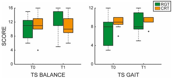 Figure 3. Tinetti Scale (TS) evaluating balance and gait functions. The left panel shows the TS balance boxplot comparing before (T0) and after (T1) RGT (green) and CGT (orange). The right panel shows the TS gait boxplot comparing before (T0) and after (T1) RGT (green) and CGT (orange). The outliers are plotted using the + marker symbol.