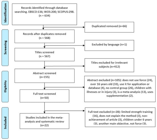 For the preparation of the document, two reviewers (J.M.M.T and J.A.G.R) independently searched articles published in Spanish and English, supplemented by a manual search, and retrospectively included references if necessary. The search for articles was carried out inEBSCO, WoS, and SCOPUS databases, with the following search strategy (‘force’ OR ‘Strength’ OR ‘energy’ OR ‘resistance’) AND (‘train*’ OR ‘prepare’ OR ‘preparation’ OR ‘exercise*’ OR ‘training’ OR ‘practice’ OR ‘physical activity’ OR ‘physical exercise’ OR ‘athletic’) AND (‘children’ OR ‘Young’ OR ‘adolescent’) and obtained a total of 634 initial articles. After eliminating duplicate articles (66), excluding language (1), titles considered irrelevant for their introduction (412), summaries (105), and full article reading (28), we obtained a final 22 optimal articles for the systematic review and meta-analysis (Figure 1). In order to obtain these articles, key words such as strength training and schoolchildren were used, taking into account their synonyms. Likewise, limits were introduced for the final collection of articles, including schoolchildren aged 6 to 16 years, strength training within and/or outside the school environment, healthy children without diseases and/or pathologies, as well as articles published between 2013 and 2023. On the other hand, articles were excluded if they included children under 6 or over 16 years of age, introduced supplements or drugs before, during, or after training, did not assess strength training, and did not carry out the training under the supervision of a physical activity professional.