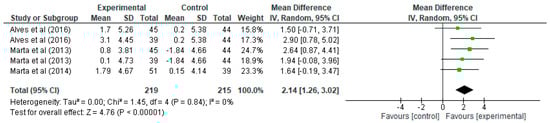 Regarding VO2max (Figure 2), it can be seen how each row presents the data for the experimental and control groups, specifying the mean, standard deviation, and the number of participants in each. In the first row from Alves et al. [21], the experimental group has a mean of 1.7 and a standard deviation of 5.26 with 45 participants, while the control group has a mean of 0.2, a standard deviation of 5.38, and 44 participants. The mean difference for this study is 1.50, with a 95% confidence interval (CI) in the range [−0.71, 3.71], indicating that, although there is an improvement in VO2max, the interval includes negative values, suggesting that the difference may not be significant in this particular case. However, the overall summary of all studies shows a mean difference of 2.14, with a confidence interval of [1.26, 3.02], indicating a significant mean improvement in VO2max in schoolchildren undergoing the strength training programme. In terms of the weight of the studies in the overall analysis, it is observed that the studies by Marta [32,33] have the highest weight, with values ranging from 18.9% to 24.7%, while the two entries by Alves et al. [21] have weights of 15.8% and 17.3%. The heterogeneity analysis in this case, shows values that indicate a very high homogeneity, with Tau2 = 0.00, Chi2 = 1.45 with four degrees of freedom (p = 0.84), and an I2 = 0%, which means that there is no significant heterogeneity between the studies, i.e., the results are consistent and do not vary significantly between them. Finally, the test for the overall effect shows a Z value = 4.76 with p < 0.00001, indicating a highly significant improvement in VO2max of the experimental group over the control. In the forest plot, the confidence intervals for each study are represented by green lines, and the mean difference is represented by green squares whose size reflects the weight of the study in the analysis. The black diamond at the bottom of the plot represents the overall estimate, which is clearly to the right of the 0 line (marking the absence of effect), confirming a significant positive effect of strength training on VO2max.