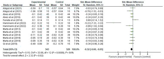 Regarding sprinting (Figure 3), it can be seen how for each study, the mean, standard deviation (SD), and the number of participants in the experimental and control groups are presented, which allows us to evaluate the differences in sprint performance between the groups that performed strength training and those that did not. For example, the study by Alagöz [20] shows that the experimental group had a mean of −0.59 and SD of 0.7 with 15 participants, while the control group had a mean of −0.57 and SD of 0.64 with the same number of participants, resulting in a standardised mean difference of −0.03 with a 95% confidence interval in the range [−0.74, 0.69]. This interval includes the value of 0, indicating that the effect is not statistically significant for this particular study. Similarly, other studies present their respective standardised mean differences and associated confidence intervals, such as the study by Hammami [29], which shows a standardised mean difference of −0.89 with a confidence interval of [−1.42, −0.04], suggesting a significant effect in favour of the experimental group, as the interval does not include the value of 0, indicating that strength training significantly improved sprinting in that study. Overall, the total standardised mean difference is −0.32 with a confidence interval of [−0.60, −0.05], indicating a generalised improvement in sprint performance after strength training, being a statistically significant result. In terms of heterogeneity, we report a Tau2 of 0.15, a Chi2 of 33.09 with 12 degrees of freedom (p = 0.0009), and an I2 of 64%, indicating moderate-to-high heterogeneity, i.e., the studies show considerable differences between them. This level of heterogeneity suggests that not all studies are completely consistent, possibly due to differences in the populations studied or in the training methods applied. However, despite this heterogeneity, the test for the overall effect shows a Z-value = 2.32 with p = 0.02, which confirms that the effect of strength training on sprinting is statistically significant across the set of studies. The forest plot visualises these standardised mean differences for each study, where the green lines represent confidence intervals and the green squares represent the magnitude of the effect for each study, the size of which reflects the weight in the meta-analysis. The black diamond at the bottom of the graph represents the overall effect, which is clearly to the left of the 0 line, confirming a significant effect of strength training in favour of the experimental group in terms of improved sprint performance.